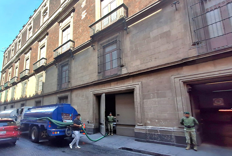 El día de hoy miércoles 16 de abril por la mañana se observaron tres pipas cargadas con miles de litros de agua, mismas que abastecieron las cisternas de Palacio Nacional, lo que indica que escasea el vital liquido en las 16 alcaldías de la capital de la república, en esta temporada de estiaje.