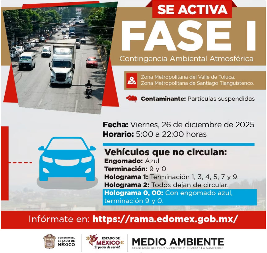 La Fase I de Contingencia Ambiental Atmosférica sigue activa este 26 de diciembre de 2025 en el Estado de México, lo que activó el Doble Hoy No Circula en varias zonas del Valle de Toluca y Santiago Tianguistenco. La decisión fue tomada tras registrar concentraciones elevadas de partículas PM10 y PM2.5 generadas por actividades decembrinas, como fogatas y quema de pirotecnia, en combinación con condiciones meteorológicas adversas.