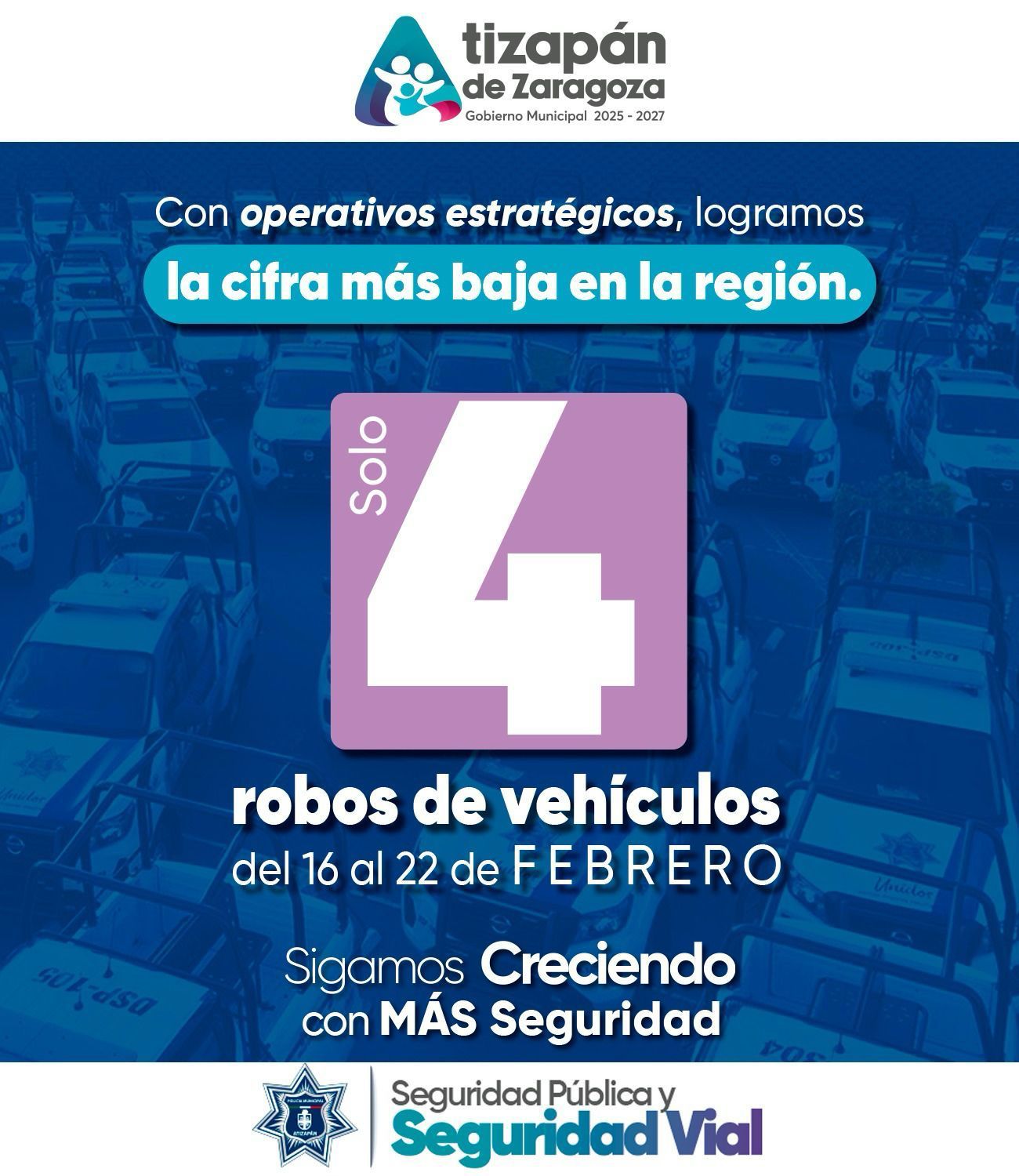 ATIZAPÁN, Méx.- Solo 4 robos de vehículos ocurrieron en el municipio de Atizapán de Zaragoza durante la semana del 16 al 22 de febrero, la cifra más baja en comparación con otros municipios de la región. Gracias a las acciones de seguridad implementadas por el Gobierno Municipal de Atizapán de Zaragoza, encabezado por el Presidente Pedro Rodríguez Villegas.