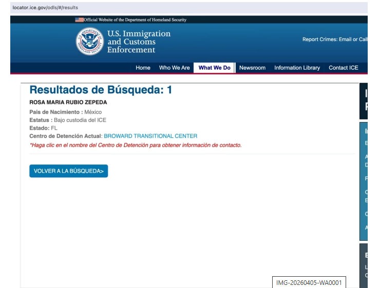Actualmente, dicha persona se encuentra bajo la custodia de U.S. Inmigration and Customs Enforcement (ICE), en el Broward Transitional Center, en espera de que se resuelva su situación jurídica.