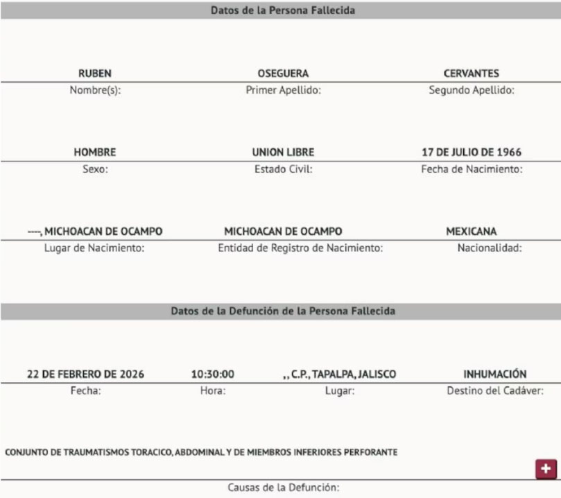 El acta de defunción número 3830, elaborada por el Registro Civil de la Ciudad de México, confirmó que Nemesio Oseguera Cervantes, alias “El Mencho” o “El Señor de los Gallos”, líder del Cártel Jalisco Nueva Generación (CJNG), murió a consecuencia de múltiples impactos de bala.