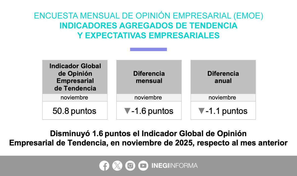 La confianza de los empresarios en México cerró noviembre en terreno negativo, hilando dos meses a la baja y reflejando una mayor cautela respecto a si este es el momento adecuado para invertir en el país, de acuerdo con el Instituto Nacional de Estadística y Geografía (Inegi).