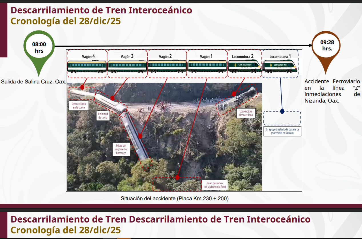 Salida de Salina Cruz, Oaxaca fue a las 08:00 horas del domingo 28 de diciembre 2025 y el accidente ocurrió a las 09:28 horas en la linea «Z», en inmediaciones de Nizada, Oaxaca, en la gráfica de observa a una locomotora y tres vagones al borde del precipicio, quedan fura de la imagen una locomotora y un vagón que cayó al barranco.