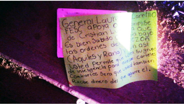 Tanto la cabeza como el narcomensaje dirigido a Laureano Carrillo Rodríguez, Secretario de Seguridad y Protección Ciudadana de Baja California, fueron abandonados en “el Puente de La Villa”, en inmediaciones de la Colonia Ciudad Jardín.