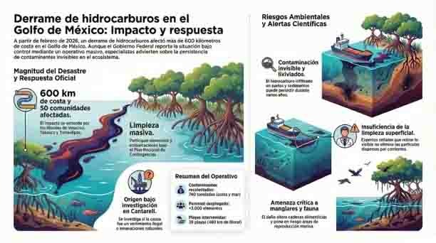 El derrame de hidrocarburo en el Golfo de México ha encendido alertas ambientales y económicas en el país. Aunque autoridades federales aseguran avances en la limpieza, especialistas advierten que los efectos podrían extenderse durante años.