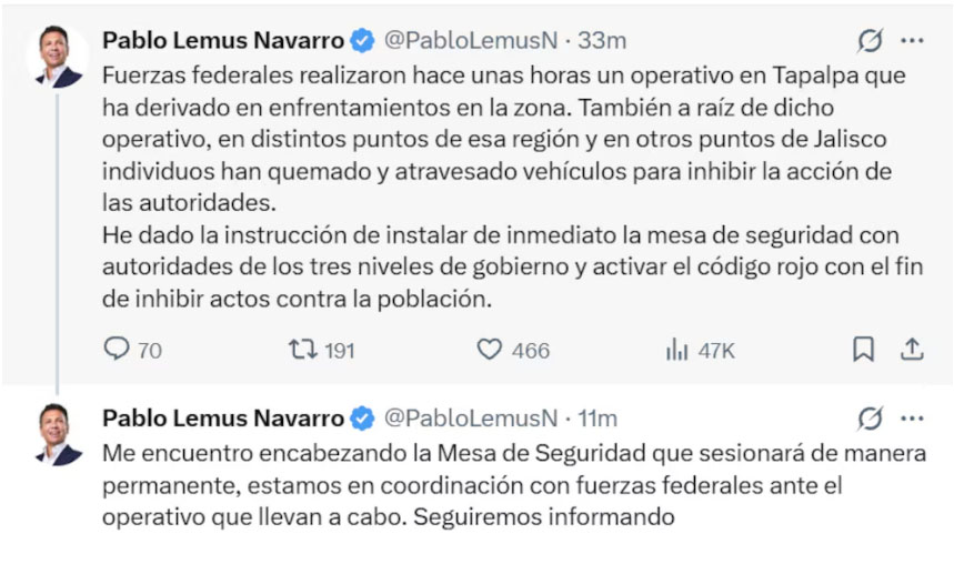 El gobernador de Jalisco, Pablo Lemus Navarro informó vía que derivado a un operativo realizado por fuerzas federales en el municipio de Tapalpa, Jalisco genero enfrentamientos y narcobloqueos, por lo que ordeno que de inmediato instalar una mesa de seguridad con la participación de las autoridades de los tres niveles de gobierno.