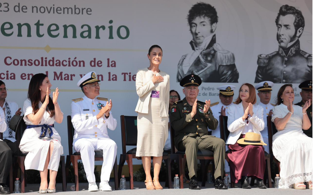 En el marco de conmemoración del 200 aniversario de Independencia del Mar, la presidenta de México, Claudia Sheinbaum Pardo, el almirante Raymundo Pedro Morales Ángeles, secretario de la Marina y Ricardo Trevilla Trejo, secretario de la Defensa Nacional, así como otros servidores públicos, el día de HOY domingo 23 de noviembre asistieron a la celebración en el estado de Veracruz.