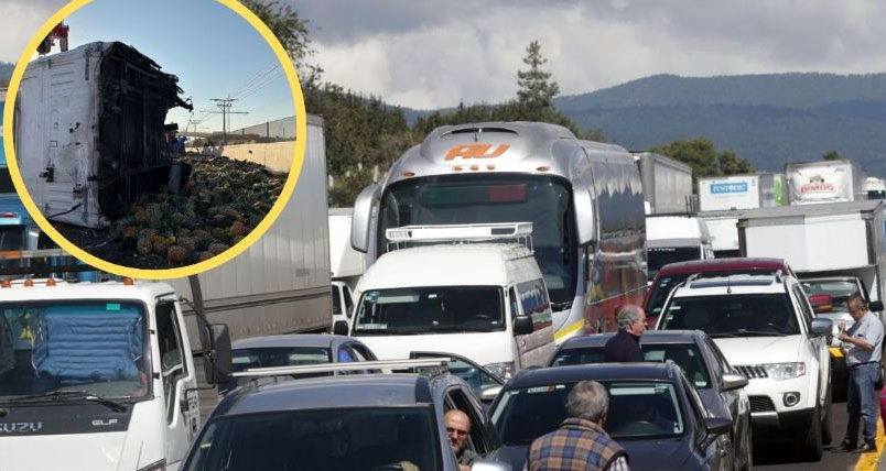 La madrugada de este jueves, un camión tipo Torton que transportaba aproximadamente 3 toneladas de piñas se volcó en la Autopista México-Puebla, en dirección a la Ciudad de México.