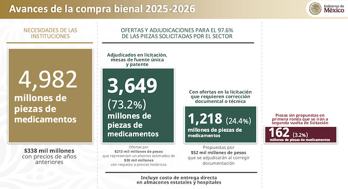 El Gobierno federal, a través de la Secretaría Anticorrupción y Buen Gobierno, frenó la compra consolidada de cuatro mil 982 millones de piezas de medicamentos, al declarar la “nulidad total” de la licitación pública internacional 2025-2026, por irregularidades.